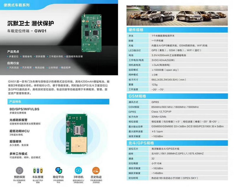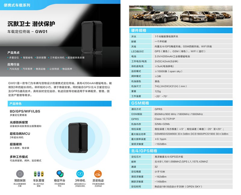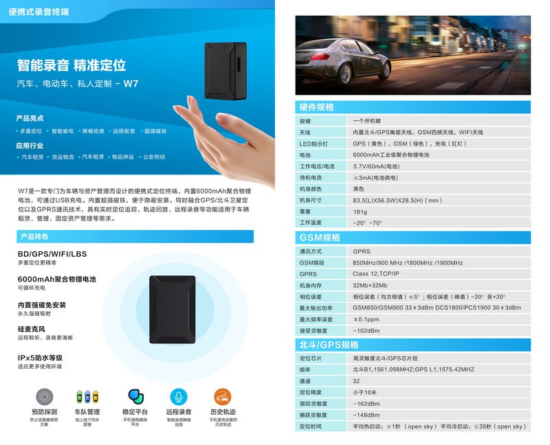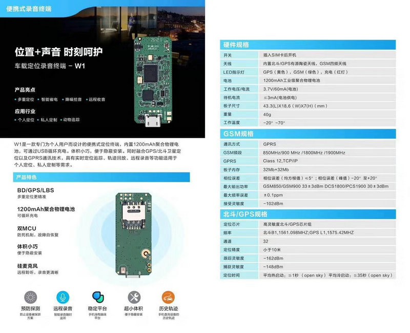 W1是一-款專門為個人用戶而設計的便攜式定位終端,內置1200mAh聚合物鋰電池,可通過USB循環充電。體積小巧,便于隱蔽安裝。同時融合GPS/北斗衛星定位以及GPRS通訊技術,具有實時定位追蹤、軌跡回放、遠程錄音等功能適用于個人定位、私人定制等需求。