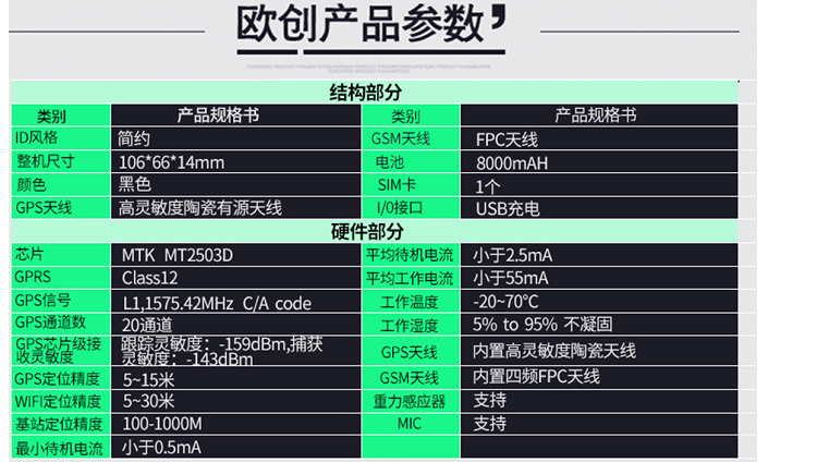 安裝:不用安裝,直接充電,充一次電用30天(通過調(diào)整回傳時間工作時間可以更長)北斗定位:屬于中國的衛(wèi)星,定位會比GPS準(zhǔn),誤差一般在5米內(nèi),但是覆蓋率不是非常的高,歐創(chuàng)芯片采用2503芯片兼容:北斗衛(wèi)星+GPS衛(wèi)星定位特點:定位會比單GPS更準(zhǔn)